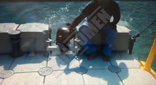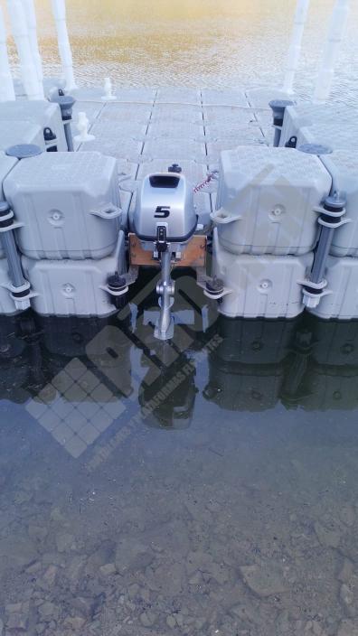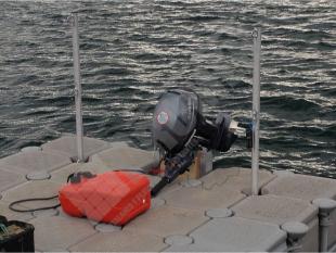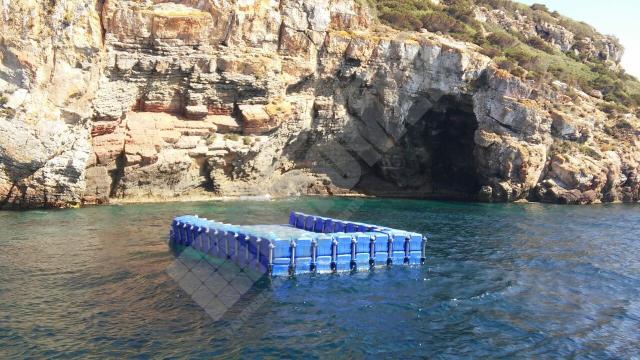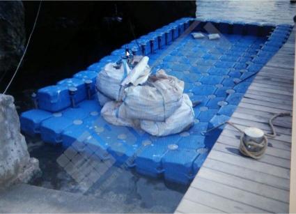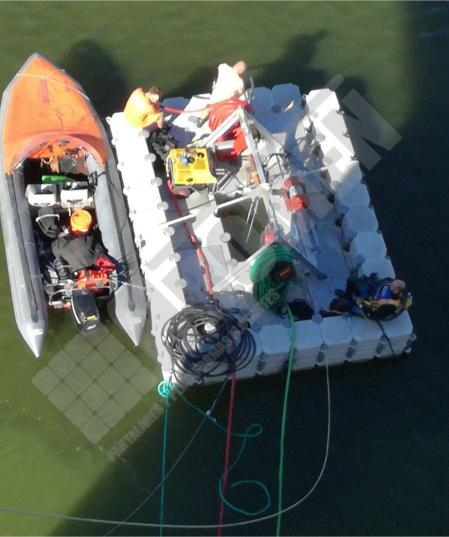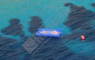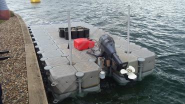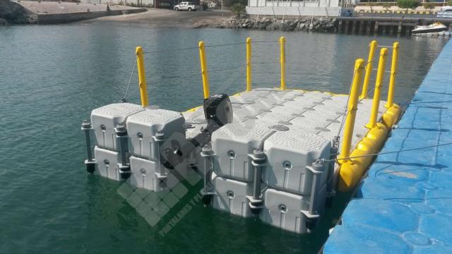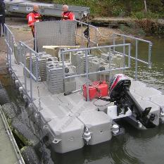 Plataforma de cubos con doble capa exterior utilizada para el transporte de materiales remolcada por una embarcación.