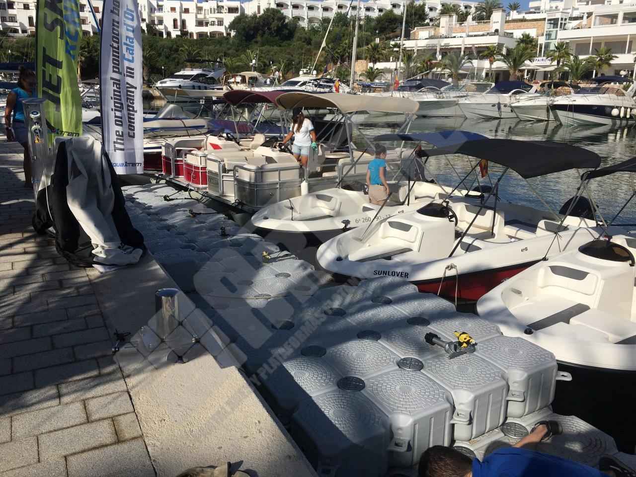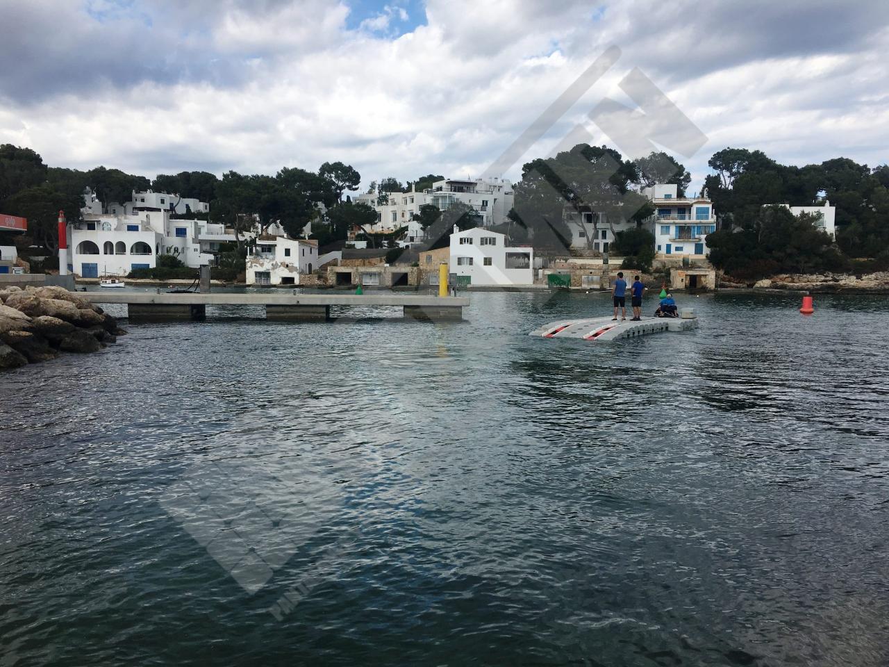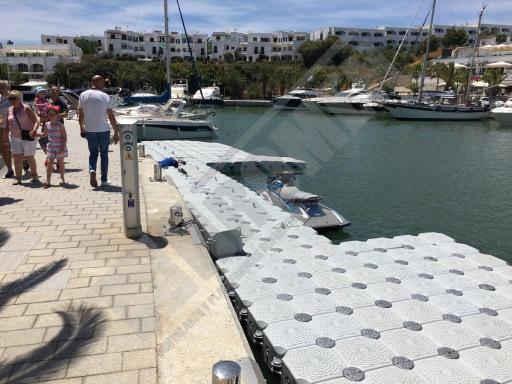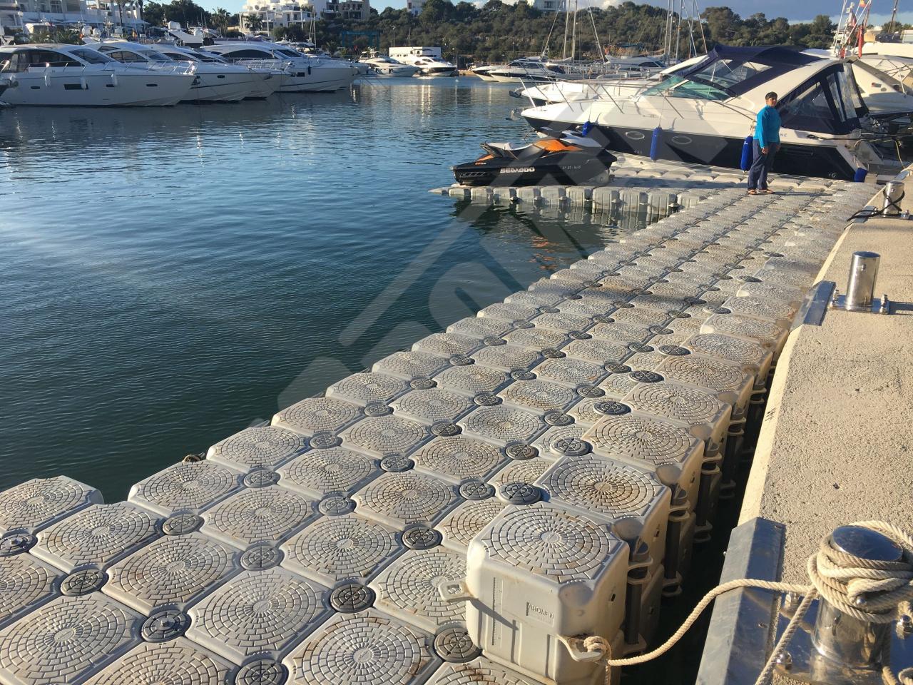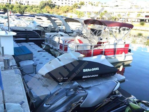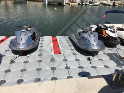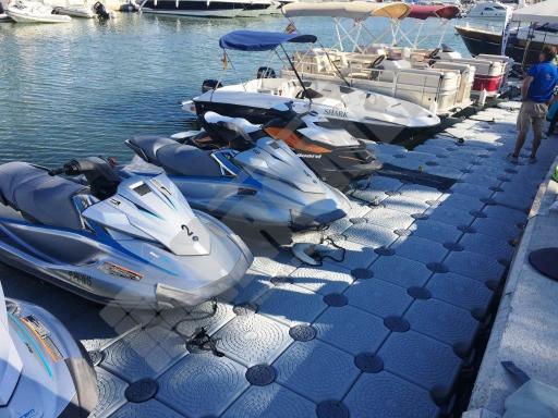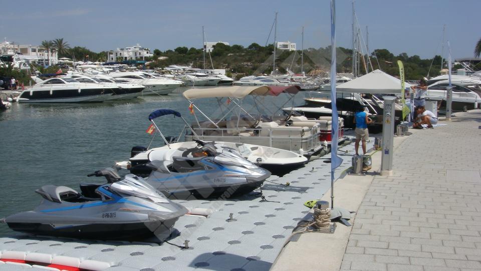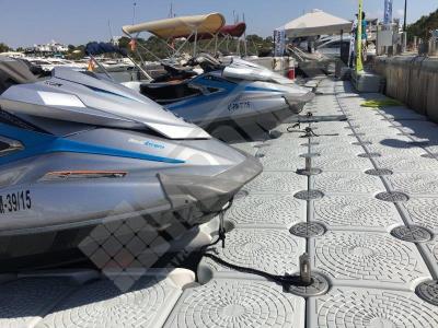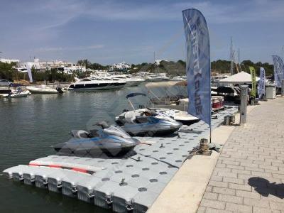 Pantalán flotante con escalón de acceso desde el muelle y puerto para moto acuática instalado en la Marina de Cala D’Or (Mallorca).