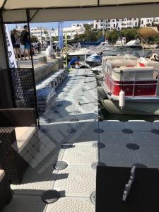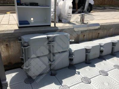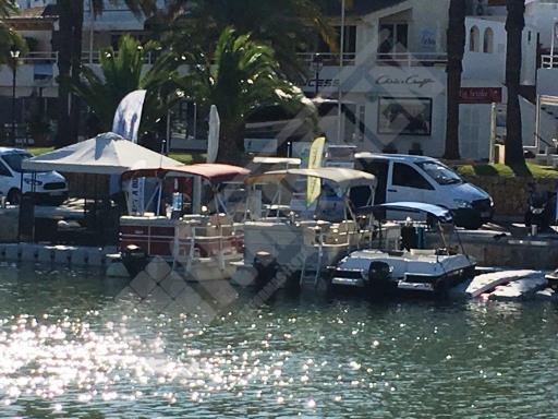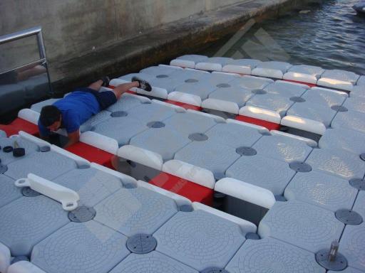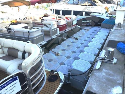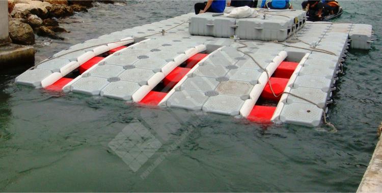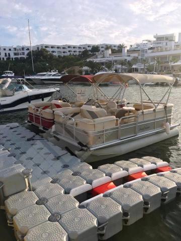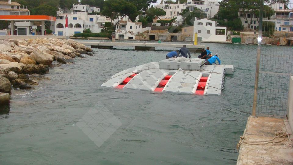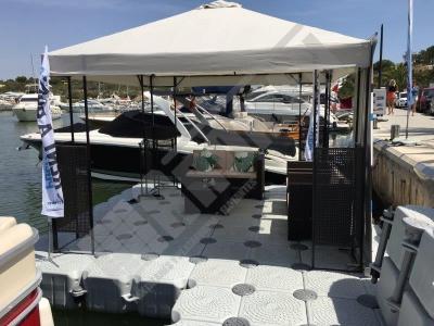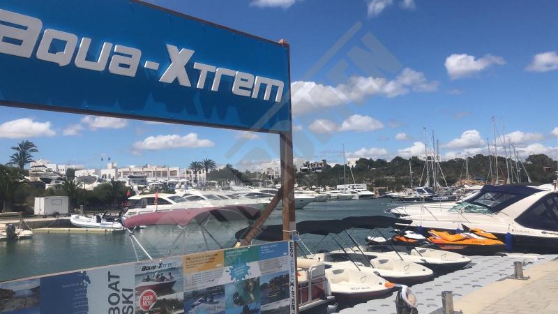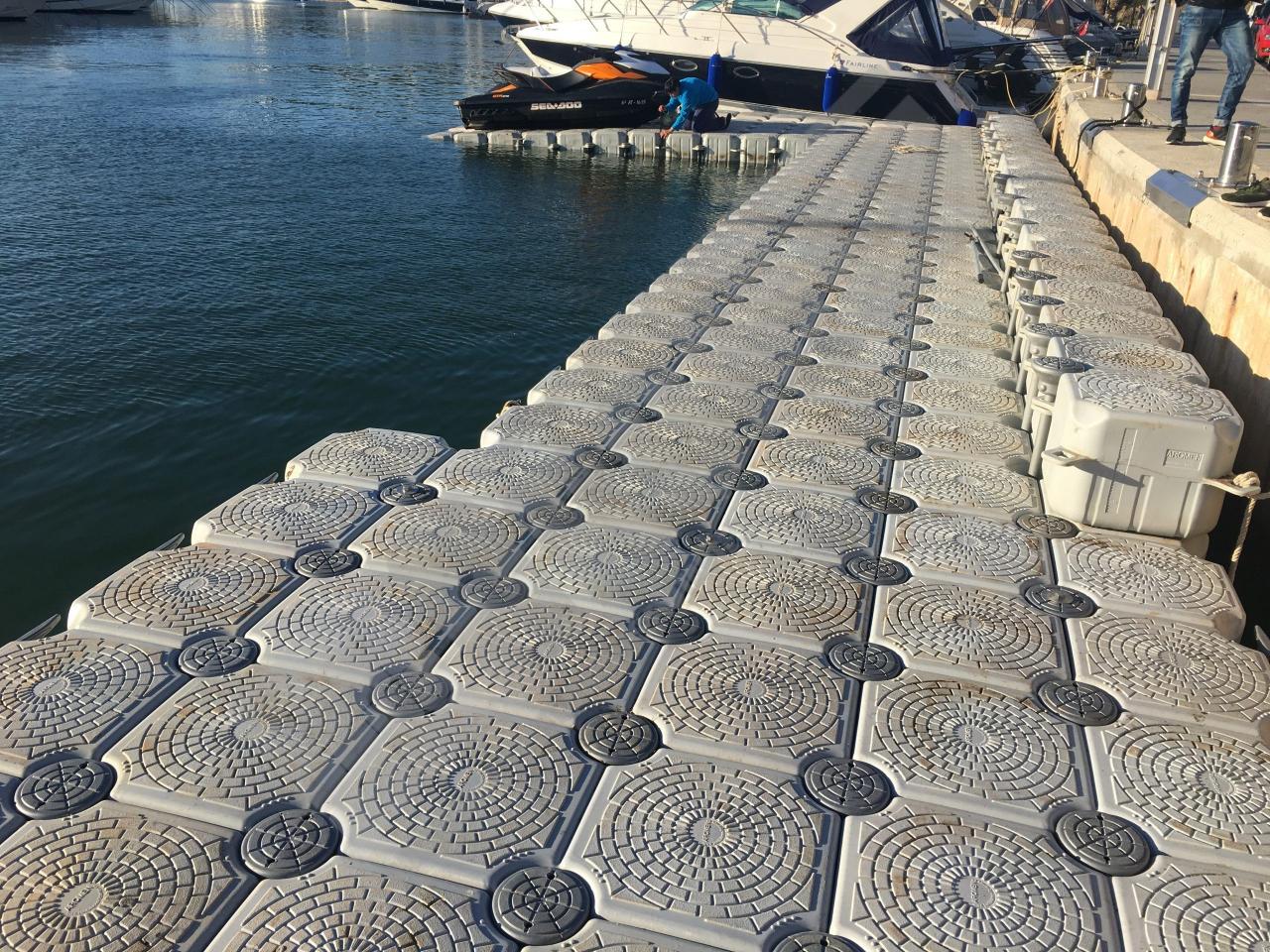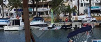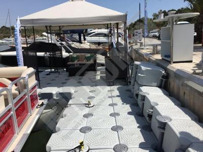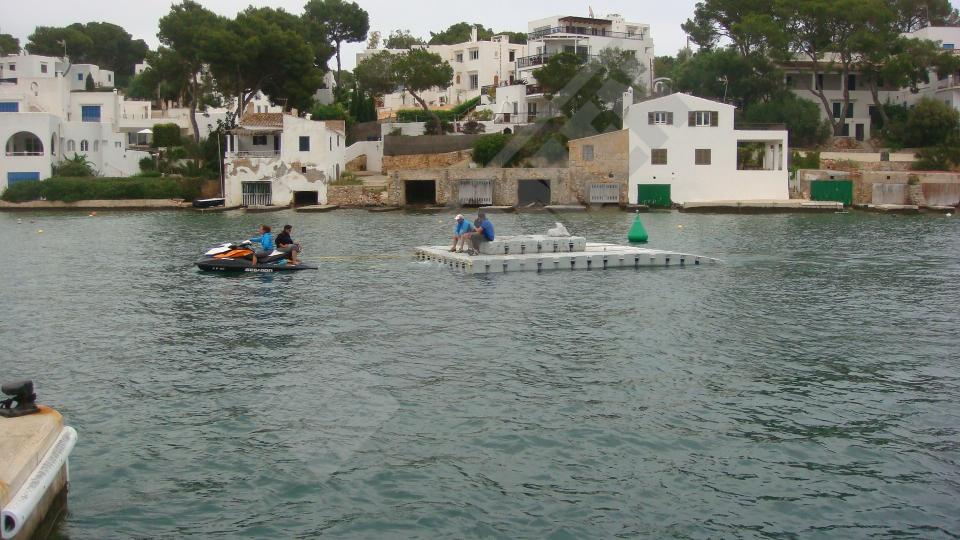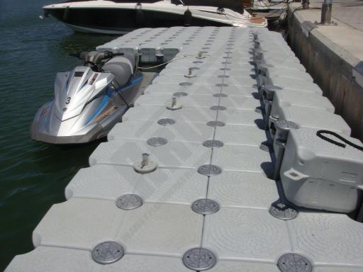 Pantalán flotante con escalón de acceso desde el muelle y puerto para moto acuática instalado en la Marina de Cala D’Or (Mallorca).