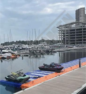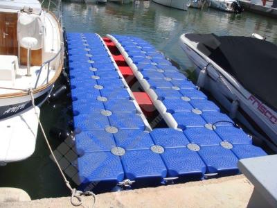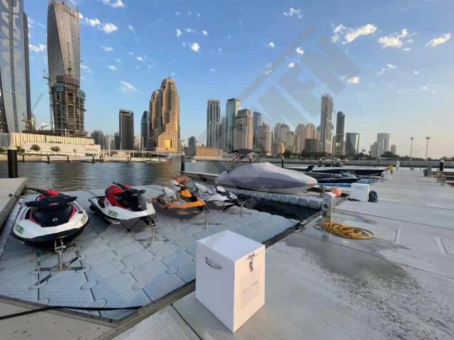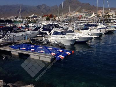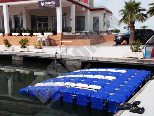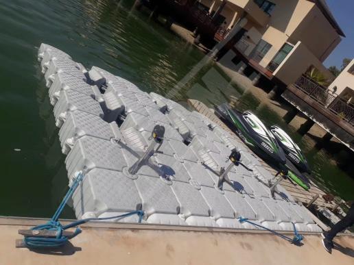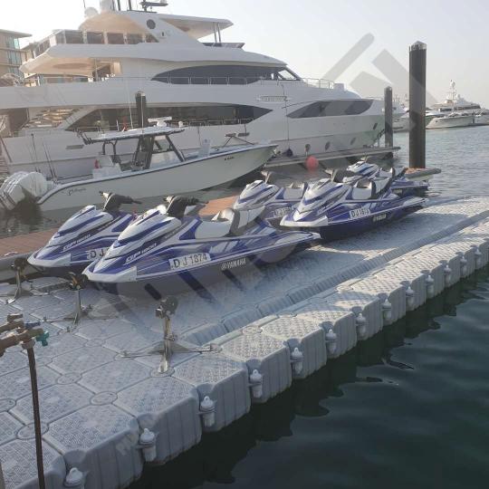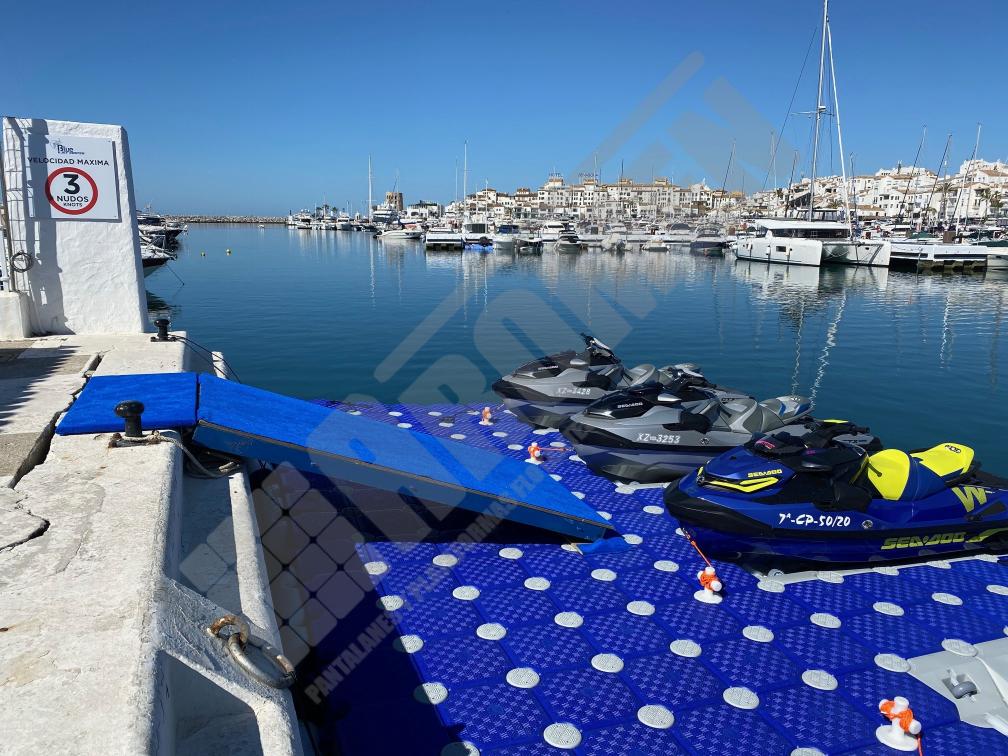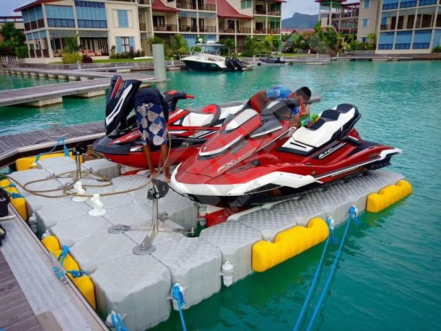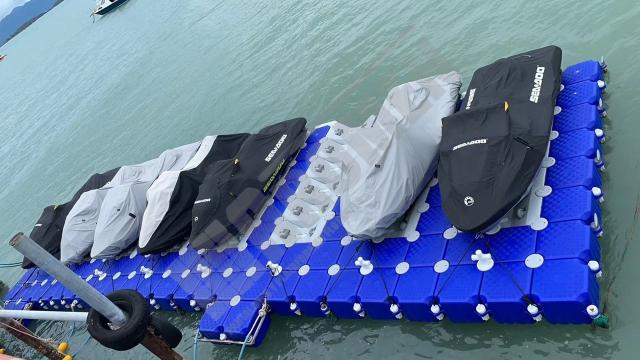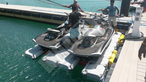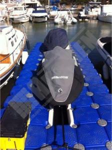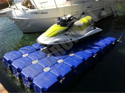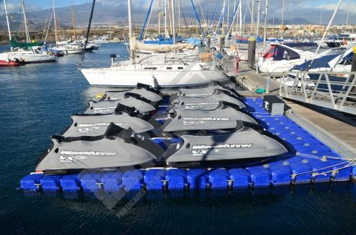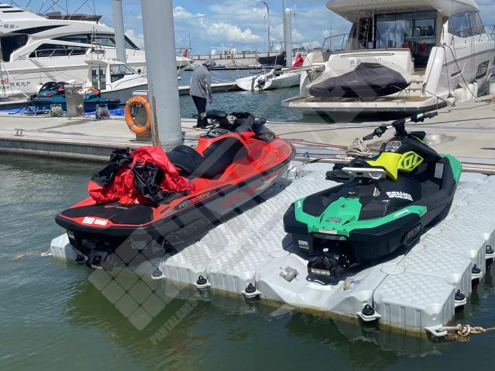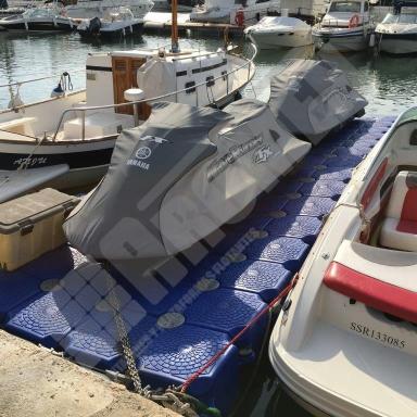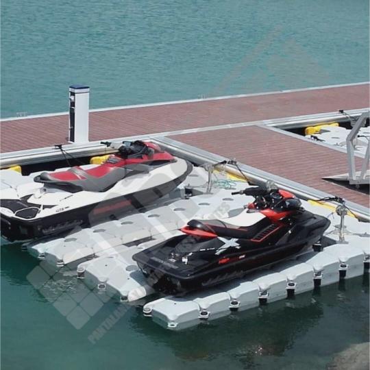Imágenes de puertos secos para motos de agua o jet ski para una o varias unidades, con diferentes configuraciones para diversos espacios o usos. Este tipo de plataformas flotantes, llevan un tipo de cubos más bajos que se utilizan como rampas de acceso y entrada para las motos de agua.