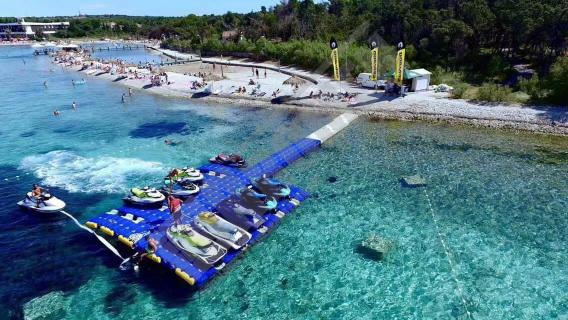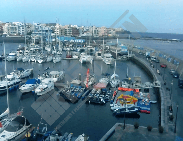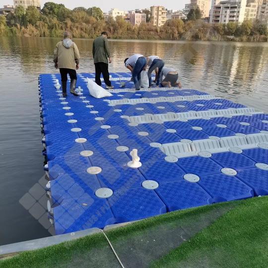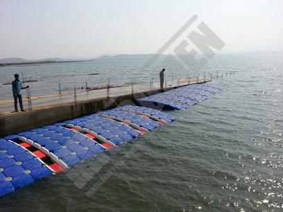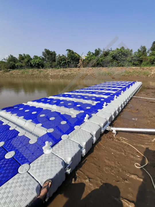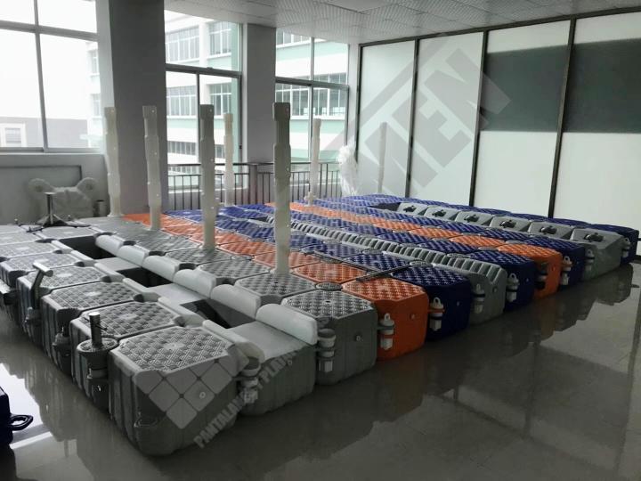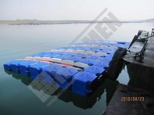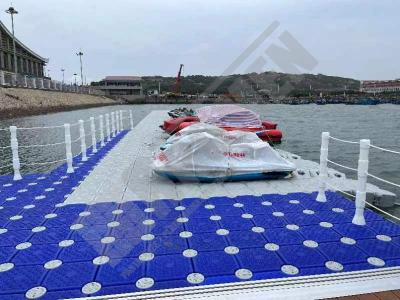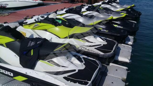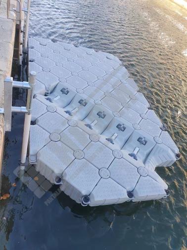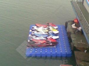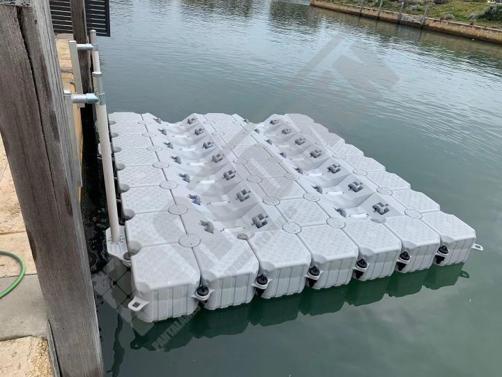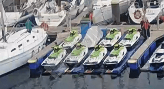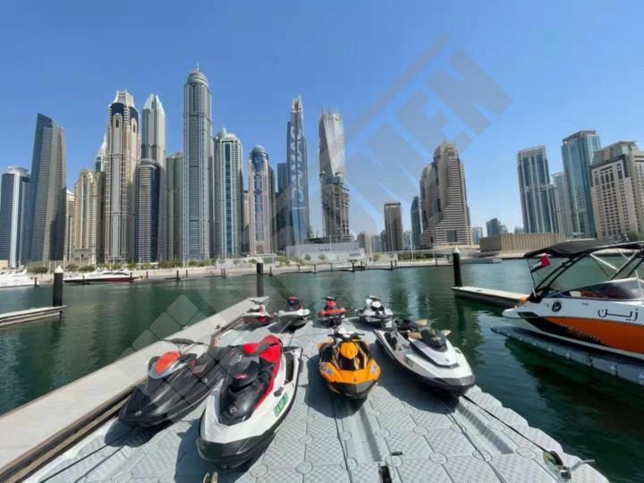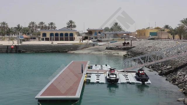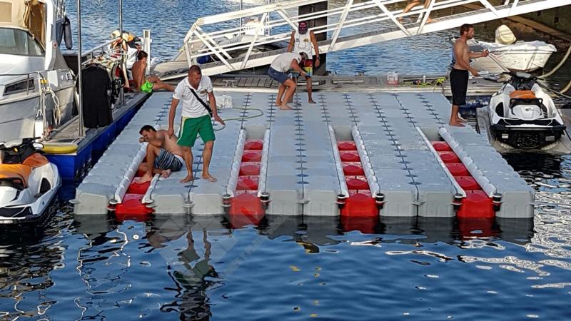 Imágenes de puertos secos para motos de agua o jet ski para una o varias unidades, con diferentes configuraciones para diversos espacios o usos. Este tipo de plataformas flotantes, llevan un tipo de cubos más bajos que se utilizan como rampas de acceso y entrada para las motos de agua.