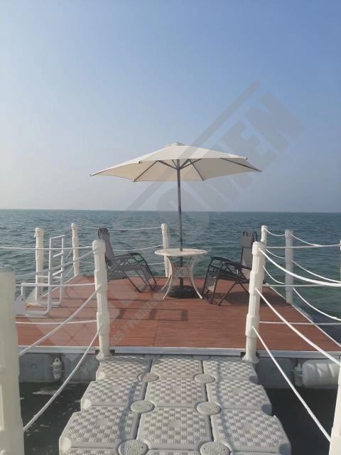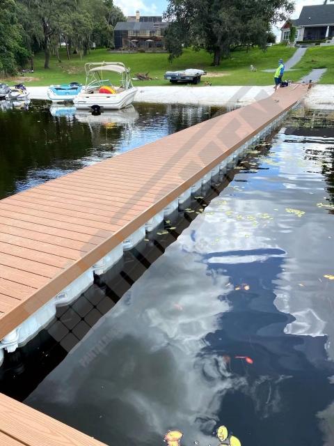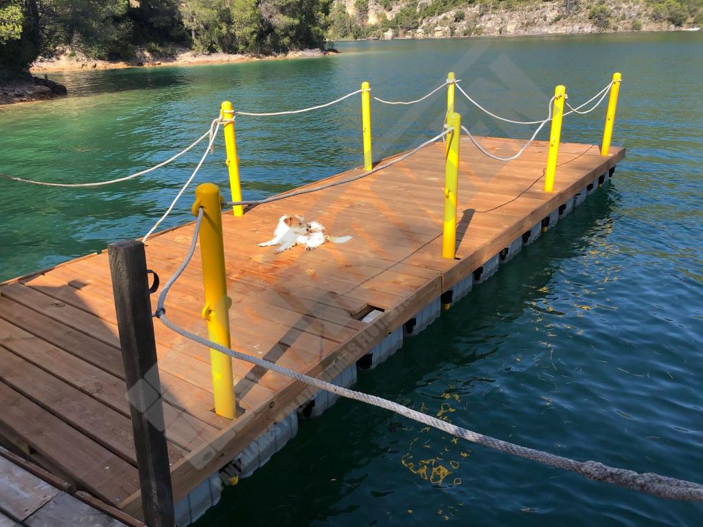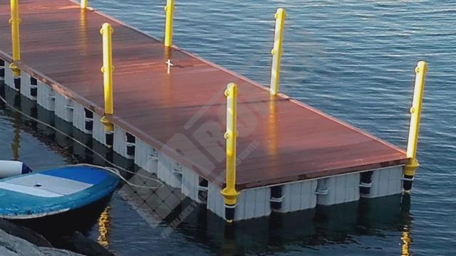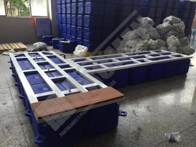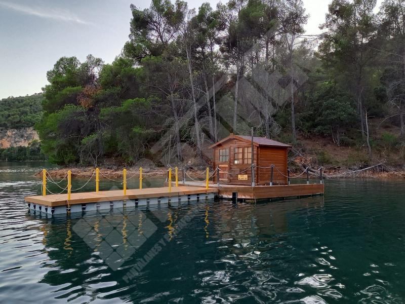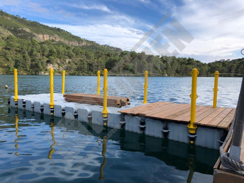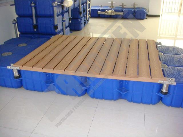 Plataformas flotantes y pantalanes flotantes de cubos de polietileno con cubierta de madera natural o con madera sintética wpc (wooden plastic composite).